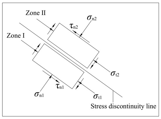 According to the theory of plasticity, the normal stress and the shear stress in the normal direction along both sides of the stress discontinuity line are equivalent (Equations (3) and (4)). Meanwhile, the stress along the tangential direction of the stress discontinuity line is discontinuous, and the stress discontinuity line must not be a stress slip line, as shown in