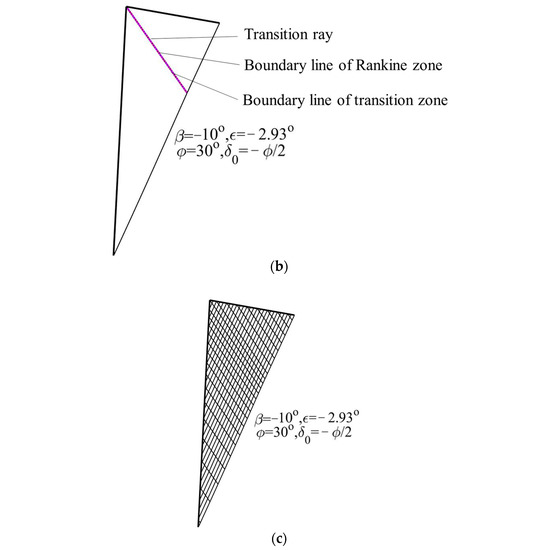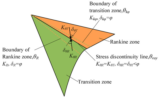 (3) Take the calculated transition ray or stress discontinuity line as the boundary line, and plot the failure lines within the Rankine zone and the transition zone, respectively. Another conjugate slip line can be constructed according to the condition that the two slip lines intersect each other at an angle of π/2 − φ, and, thus, slip-line fields with stress discontinuity can be obtained.
