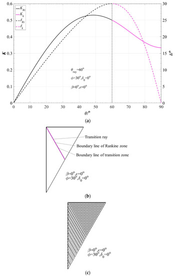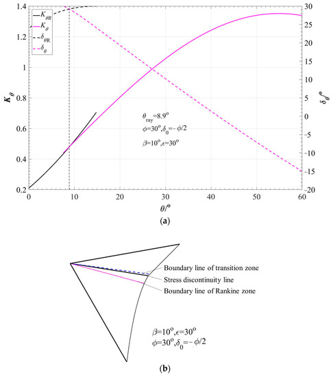 is the inclination of the failure surface in the transition zone; and the value of Ka(j=1) is the active earth pressure coefficient Ka. If Δ > 10−3, change the earth pressure coefficient, Ka(j), and repeat step (2) until the stress features of the intersection line in step 2(a) or step 2(b) is satisfied.