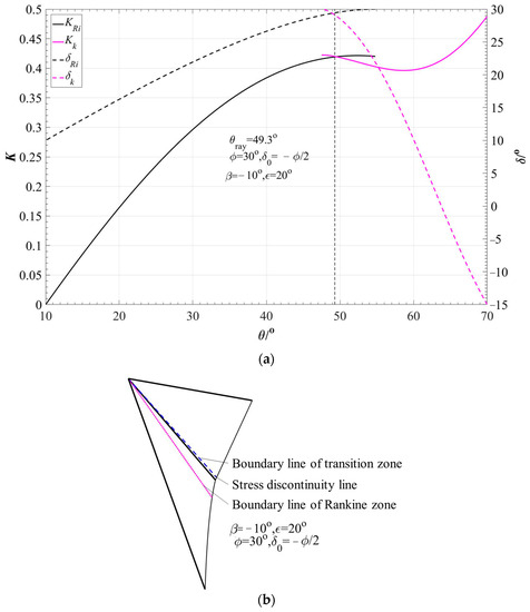25]. To computing slip-line fields with stress discontinuity, the potential failure zone is divided into the Rankine zone and the transition zone; the Rankine zone can be determined strictly based on the theory of plastic mechanics; and the boundary of the transition zone needs to be determined using an iterative procedure. The lateral pressure coefficient and the interslice force inclination angle of the slice lines within the Rankine zone and the transition zone can be calculated by using an iterative procedure, and then we can determine the location of the stress discontinuity line. Finally, the earth pressure and the slip-line fields with stress discontinuity can be obtained. The main calculation process are as follows: