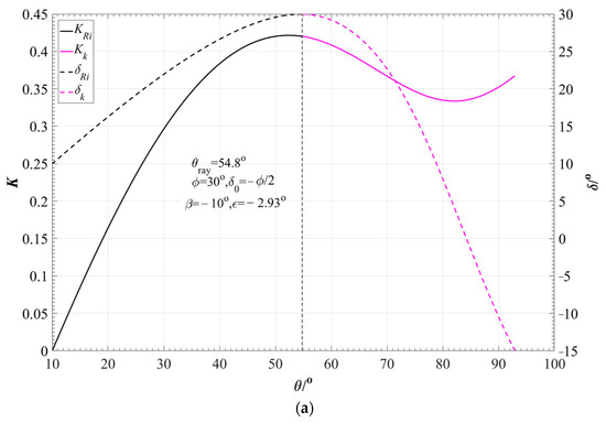 equality, where Δδ is the difference of the interslice force inclination angle of the intersection line calculated by the Rankine zone equation and the transition zone equation, and is the average value. ΔK is the difference of the lateral pressure coefficient value of the intersection line calculated by the Rankine zone equation and the transition zone equation, and is the average value.). If there is an intersection line satisfying the conditions, that is, Δ ≤ 10−3, the intersection line is the stress discontinuity line, which inclination angle is denoted by θray; αk(k=1,2,…,k)