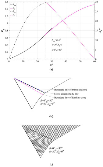 φ = 30°. It is obvious that with a decrease in the soil–wall interface friction angle, the slip-line field gradually shows stress discontinuity, and the smaller the soil–wall interface friction angle, the smaller the inclination angle of the stress discontinuity line, that is, the closer to the backfill surface.