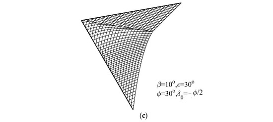 21] proposed the conditions of concave failure surface, convex failure surface, and plane failure surface and used the logarithmic spiral method to calculate passive earth pressure; the result for the concave failure surface indicates that there is stress discontinuity in the slip-line field. There was a similar phenomenon in Zhu et al. (2000) [