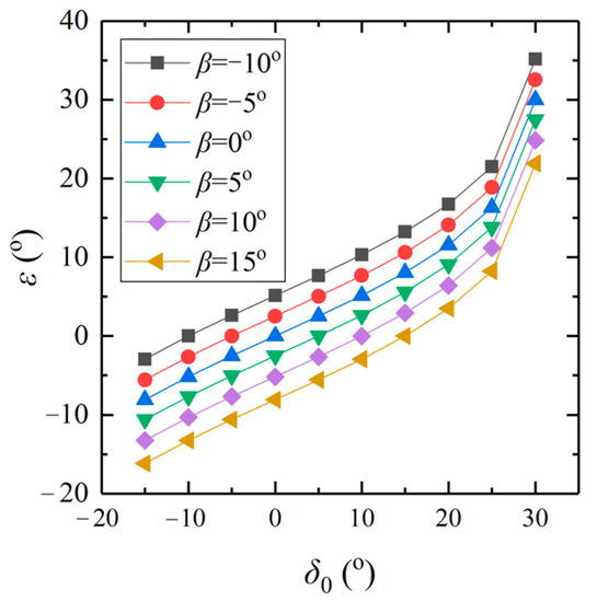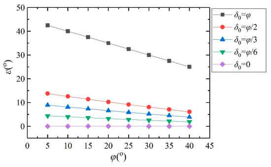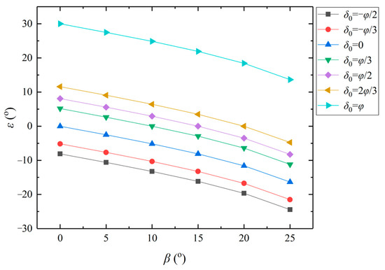 Figure 14 that with an increase in the backfills’ inclination, the ultimate inclination of a retaining wall gradually decreases. Moreover, it can be clearly seen that when the soil–wall interface friction angle is equal to the internal friction angle, the ultimate inclination increases significantly. Finally, we can draw the conclusion that the soil–wall interface friction angle has a great impact on stress discontinuity.