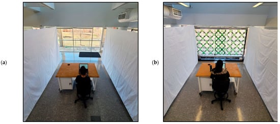 Two identical experiment rooms were constructed out of hanging white curtains. Following standard office sizes found in Architectural Graphic Standards, the rooms measured 10 ft × 15 ft [48]. The experiment room faced the microalgae facade prototype (which stands in front of a window), and the control room faced a window with an un-obscured outdoor view (Figure 2). Each room featured a single desk and chair in the middle of the room facing the windows (Figure 3).