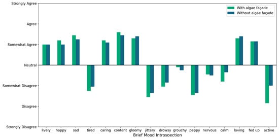 Figure 4 illustrates the average effect of performing the design tasks with and without the microalgae facade. The result shows that the microalgae façade did not specifically affect student mood. A difference appears in the feeling of being active. The microalgae façade tends to make the participant feel less active than without.