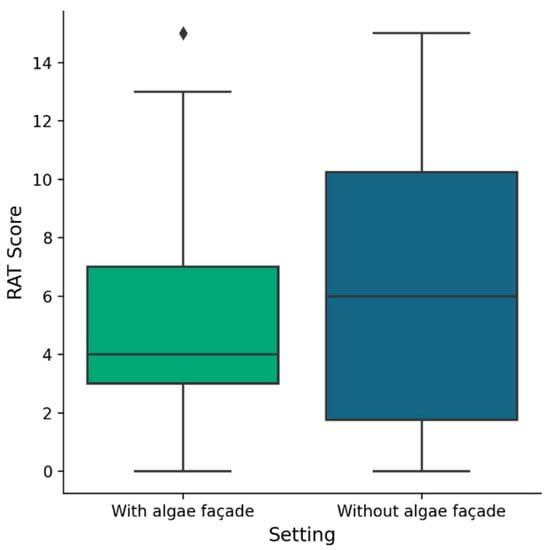 Effect of the algae facade on the RAT score; the microalgae façade did not have a greater impact on convergent thinking than the controlled group.