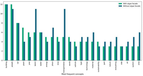 Frequency of concepts for the brainstorming tasks in a room with an algae facade and without an algae façade.