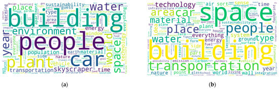 We produced word clouds to provide a qualitative representation of important topics in architecture students’ solutions for a sustainable city in the future (Figure 8). For participants that brainstormed in the microalgae environment (Figure 8a), their concept centered on buildings, people, plants, and cars. On the other hand, recurring topics for architecture students that performed the brainstorming in the control environment are building, people, transportation, and space (Figure 8b).