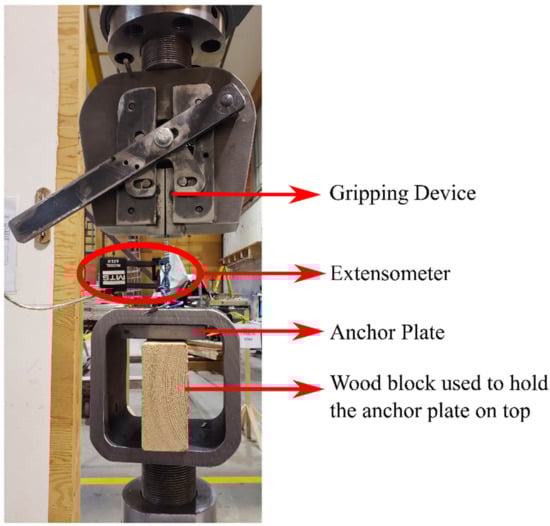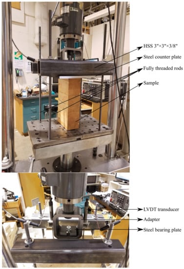 The test setup with a trial sample used for the withdrawal test is exhibited in Figure 6. The withdrawal displacement of the screw from the top wood surface was measured with two displacement (linear variable differential transformer (LVDT)) transducers. The load-displacement curve for each specimen was recorded, from which the withdrawal strength and stiffness were determined. The load-displacement curves and withdrawal test data from the withdrawal tests were used in the finite element model as input parameters.