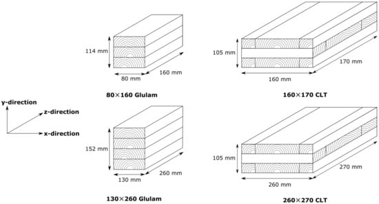 Glulam of two different sizes from the same manufacturer and CLT made from 2 × 4 laminates (160 × 170 CLT) and 2 × 6 laminates (260 × 270 CLT) from two different manufacturers were tested. The two sizes of glulam and the two types of CLT used are shown in Figure 3. According to the technical specifications of the CLT manufacturer, the longitudinal (major) and the transverse (minor) layers of CLT were made from lumber of different grades. Thus, the laminates of the longitudinal and transverse layers might have come from different sources, and the swelling properties of the longitudinal and the transverse layers of CLT were determined separately. Both sizes of glulam used in the test program were of the same grade and from the same manufacturer. Furthermore, the glulam was of compression grade, which means all the laminates were of the same grade. Thus, all the layers of both sizes of glulam were considered to have the same swelling properties.