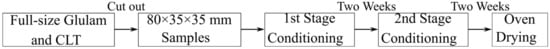 In two stages, each sample group was conditioned under constant relative humidity and temperature conditions. The conditioning time for each stage was two weeks. The samples were kept in a conditioning chamber in the first stage with 65 ± 2% relative humidity and a temperature of 20 °C. In the second stage, the samples were kept in another conditioning chamber. The three sample groups were kept in three different conditioning chambers in the second stage, as shown in Table 4. The first conditioning stage was adopted to achieve an equilibrium moisture content (EMC) of 12% for all specimens. The second conditioning stage aimed to achieve EMCs of 6%, 16%, and 21% (Table 4). All the samples reached a constant weight at the end of the two-week conditioning process, indicating uniform moisture content distribution inside the samples. After the two-stage conditioning, the samples were oven dried at 105 ± 1 °C for two days to achieve an oven-dry condition. The sample preparation, conditioning, and oven-drying process for the swelling tests are summarized in the flow chart shown in Figure 4.