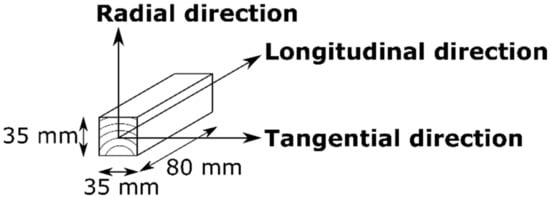Small-size samples of approximate dimensions of 80 (longitudinal) mm × 35 (radial) mm × 35 (tangential) mm were cut from the different layers of CLT and glulam. It was ensured that the samples had no glue on any face. Three sample groups were prepared with these small-sized samples to investigate the dimensional changes with moisture content change. The number and type of specimens in each sample group are summarized in Table 3.