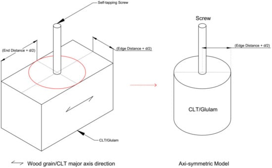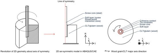 The 3D system of the self-tapping screw inserted centrically into CLT/glulam was reduced to an axisymmetric model, as shown in Figure 7. The radius of the axisymmetric model is defined by the minimum of the (edge distance + d/2, where d is the outer thread diameter of the screw) and (end distance + d/2) of the screw inside the CLT/glulam. In ABAQUS/CAE, an axisymmetric model was generated by revolving a 2D plane about a symmetry axis and is described by a cylindrical coordinate system, as illustrated in Figure 8. In Figure 8, the symmetry axis lies along the longitudinal center line of the screw, which implies that the screw is placed centrically with the wood grain direction running along the cylinder’s circumferential direction.