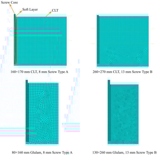 The screw core and the wood were modelled as linear elastic materials, and the soft layer was assigned the same material properties as the wood member []. The screw core was assigned isotropic material properties, whereas the wood was assigned orthotropic material properties. Local material orientation was assigned to the wood member, wherein the angular value was set per the average angle between the tangent to the annual rings and the horizontal direction of the CLT/glulam laminate’s end grain. The CAX4 elements of ABAQUS/CAE were used in the finite element model.
