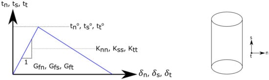 The CZM approach can adequately describe the pull-out behavior of the screw during axial loading []. The cohesive contact interaction in ABAQUS/CAE requires three input parameters: an elastic behavior defined by the stiffness values, a damage initiation criterion, and a damage evolution model. The stiffness values along three directions were the normal direction (Knn), which is perpendicular to the screw longitudinal axis; and the two transverse (shear) directions (Kss and Ktt), wherein one was parallel to the screw longitudinal axis and one was parallel to the tangent to the cylindrical screw surface (Figure 10, right). The stiffness of the normal direction is less critical in this study as the axial loading is of primary interest here. The stiffness values along the two shear directions were assumed to be equal. The two shear directions correspond to the direction parallel to the screw axis and the direction tangent to the screw diameter. Since the 2D axisymmetric modelling technique is adopted here, the shear direction parallel to the screw axis affects the numerical solution. Assuming the same value of stiffness along the other shear direction tangent to the screw diameter has no effect on the numerical solution,, according to the traction separation law, the stiffness values relate the tractions (tn, ts, tt) in the three directions to the separation () in the respective directions (Figure 10, left).