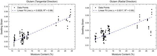 The swelling coefficient can be determined by determining the slope of the swelling strain versus moisture content change graph. For this purpose, the strain values along the three orthotropic directions were recorded under different known moisture content changes. The strain value and the moisture content change of a sample can be determined using Equations (1) and (2) []: