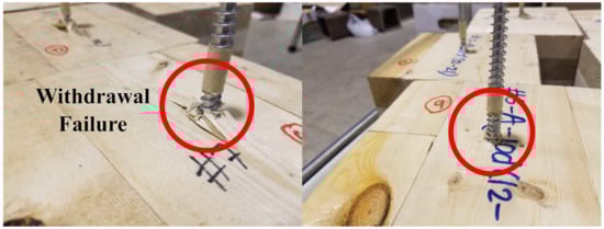 The failure mode of the specimen after the withdrawal tests is shown in Figure 12. The failure of the screws inside the samples were marked by pullout of the screws. The withdrawal failure is seen by the vertical pullout of the taped part of the screw, which was initially in contact with the top wood surface. None of the screws broke inside the wood after the tests.