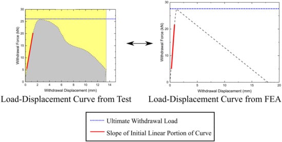 The applied force and the corresponding withdrawal displacement calculated using Equation (4) were used to plot the load-displacement curve for each specimen. From the load-displacement response, the withdrawal stiffness was calculated according to Equation (6):