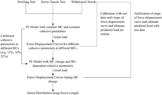 For simulating the screw pull-out behavior under moisture content variation, an axial load was applied to the top surface of the screw core in the finite element model under (1) displacement control and (2) force control, with proper support and moisture content, that is, in terms of temperature and boundary conditions. The displacement-controlled axial load was applied by specifying a displacement boundary condition. The force-controlled axial load was applied by specifying a concentrated force acting on top of the screw core.