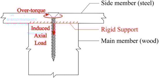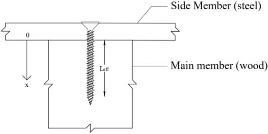 The combination of sufficiently high axial load value and moisture swelling of wood might cause the tensile failure of self-tapping screws. In two-member connections, like the one shown in Figure 16, the high axial load values might arise if the screw is installed very tightly, at a higher torque than required. The torque requirements for screw installation usually are provided by the screw manufacturers. In Figure 16, the side member is assumed to be sufficiently rigid to support the main member’s top surface. This condition then becomes similar to screw withdrawal under the pull–push loading condition. An over torque in the screw in this condition will induce an additional axial load in the screw. If one supposes that the main wood member undergoes moisture swelling in this over-torqued condition, then the numerical model described here can be used to predict the average axial stress distribution in the screw inside the main wood member due to the wood’s induced axial load and moisture swelling.