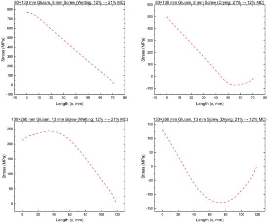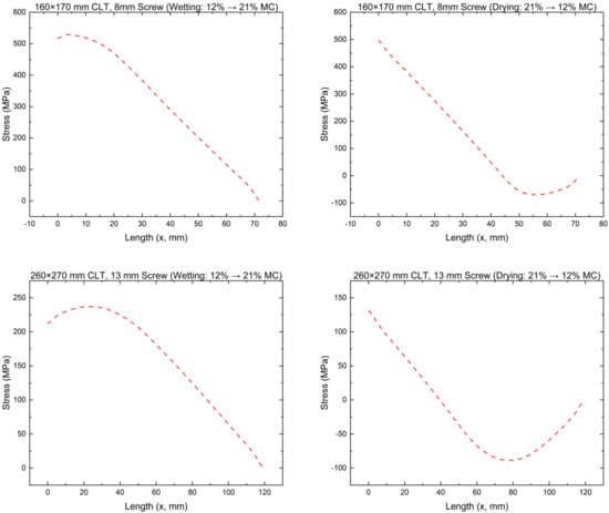 Figure 17 illustrates the origin of the coordinate system for the screw stress distribution in a typical two-member connection with a self-tapping screw. As the pull–push loading condition is similar to the two-member connection where the side member is assumed to be sufficiently rigid to provide support to the top surface of the main wood member, the stress distribution given by the finite element model represents the average stress distribution of the screw in the x-direction with the starting point at the top surface of the main member and ending point at the effective penetration length (Leff). The stress distributions from FEA are illustrated in Figure 18 and Figure 19, respectively, for the cases of CLT and glulam wetting, an increase of moisture content from 12% to 21%, and drying, a decrease of moisture content from 21% to 12%, respectively.