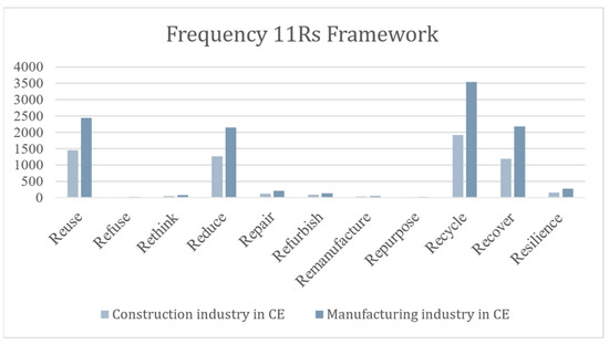 Rs’ frequency in the papers that were classified as within construction industry and CE and manufacturing industries and CE. Source: Author’s conception, based on Python script results and visualized through a Microsoft Excel chart.