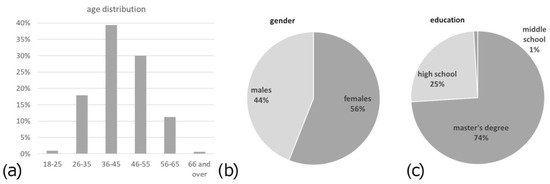 Sample distribution: (a) age, (b) gender, and (c) level of education.