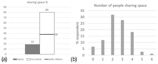When the respondents submitted the questionnaire, 75% of them had been WFH for more than 1 month, 22% for more than 2 weeks, and 3% between one and two weeks. The survey shows that only 19% of respondents work alone, and more than 80% share the spaces with other family members; about half of the latter, 38% of the total, share their working life with one or more children (Figure 3).