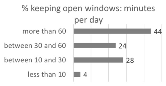 The questionnaire included a question asking who opened the windows for air exchange and, if so, for how long. The results were that, among those who opened the windows, 44% did so for more than an hour, 24% between 30 and 60 min, 28% between 10 and 30 min, and 4% for less than 10 min (Figure 5). We repeated the analysis relating to the perception of outdoor noise considering only the responses of the 56% who did not open the windows, and we obtained the same trend obtained on the whole sample; therefore, the following considerations are valid for the whole sample.
