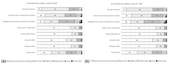Considering outdoor noise (Figure 6), it can be seen that the noises that are not perceived or only slightly perceived as annoying are related to factories, shops, and restaurants, followed by traffic.