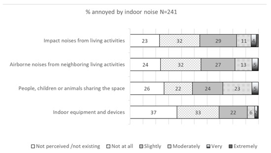 Airborne and impact noises coming from neighboring dwellings are perceived and partly annoying (38–39%), while 50% of respondents say they are annoyed by people, children, or animals who share the space.