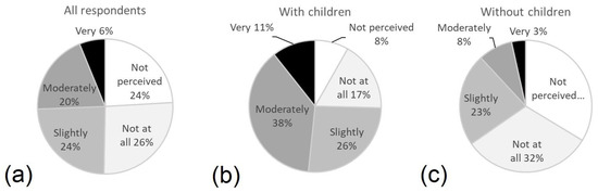 It is interesting to analyze how the presence of children influences the answers regarding annoyance from neighbors and cohabitants (Figure 8). Most of the children who share the space are under six years old (30%) and between six and twelve years old (28%). In situations with children (38% of the total), there is an increase in “moderately” and “highly perceived” responses: 49% compared to 11% of respondents without children (62% of the total).