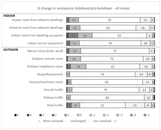 Changes in annoyance with different indoor and outdoor noise sources during lockdown compared to pre-lockdown.