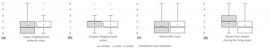 Boxplots of scores for the comparison lockdown/pre-lockdown: 0 = not annoyed, 5 = extremely annoyed: (a) indoor neighborhood airborne noise, (b) outdoor neighborhood noises, (c) road traffic noise, and (d) noise from people sharing the living space.