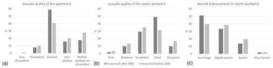 The aspect related to the age of the building was considered; given the considerations made in Section 2 above on improving acoustic performance in buildings, it was decided to reduce the significant time frame for the descriptive analysis regarding the age of the building from 2000 to date (22% of respondents). Figure 11 underlines a better quality expressed by those who live and work in buildings built after 2000, confirming the trend indicated by [12,13] for the improvement of the acoustic performance of buildings in Italy over time; in particular, they are more satisfied with the quality of the apartment (Figure 11a), they believe that the quality of the room where they work is better (Figure 11b), and they require fewer changes (Figure 11c).