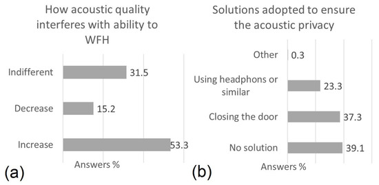 Furthermore, most respondents believe that the AQ of their home can improve their work performance, even if more than half of them take measures (headphones, closing the door, and other) to ensure acoustic privacy. This would confirm that WFH is affected more by the acoustic environment than by relaxation, in line with the main findings of [11] and in contrast to the findings of [4], where only 25% of respondents reported that noise conditions negatively affected their ability to work from home.