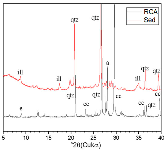 XRD patterns of RCAs and SEDs; qtz, quartz; cc, calcite; e, ettringite; a, albite; ill, illite.