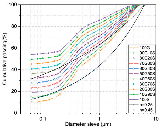 The mix optimization was performed using the Talbot–Fuller–Thompson spindle semi-empirical method, which allowed us to determine the proportion of sediment (S) and RCAs (G) to create a granular skeleton with minimum voids and maximum compactness. The spindle was obtained using Equation (1) [8]: