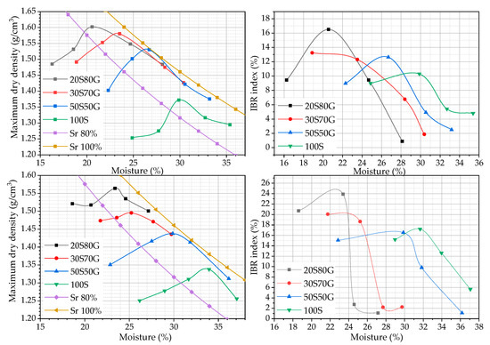 Figure 4a shows the IBR indexes for non-treated mixes, which reach IPI indexes of less than 20%, ranging between 4.91% and 9.45%. Their dry density optimal water content values were between 1.37 and 1.60 g/cm3 and between 20.5% and 28.7%, respectively. Thus, it does not allow them to be used as road subgrade.