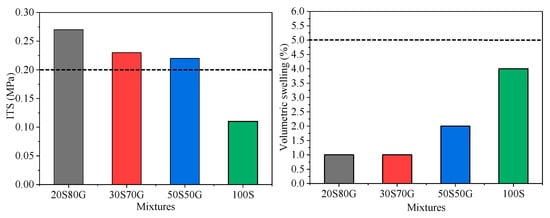 The treatment suitability test helps to ensure the sought dimensional stability and mechanical behavior in special conditions and in a relatively short time. The objective is to accelerate the hydraulic setting, which occurs in various mixes. Figure 5 shows the ITS and swelling volume of the mixes after immersion in water. The results show that all the mixes satisfied the indirect traction criterion except for mix 100S, which had an ITS value of 0.11 MPa. The swelling volume for all the mixes were below the threshold of 5%. Therefore, all the mixes except 100S are suitable for treatment.