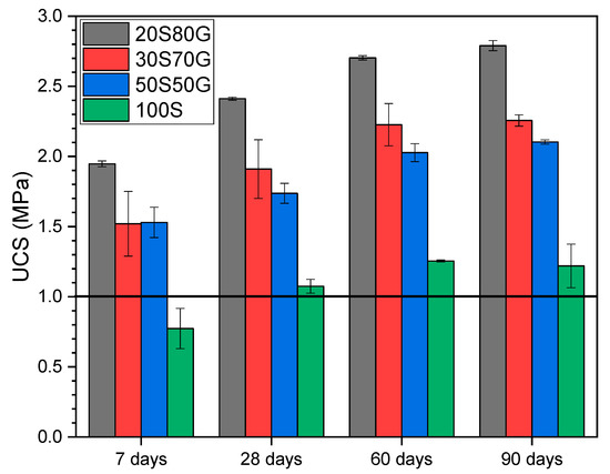 The UCS and ITS values of the various mixes after 7, 28, 60 and 90 days of curing, shown in Figure 6, increase with the curing time for all the mixes. The UCS values show an initial strong increase initially and a stabilization afterward. The mixes 20S80G, 30S70G, and 50S50G reached the circulation age requirement after 7 days, while mix 100S reached it after 28 days.