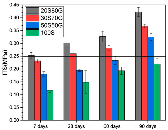 On the other hand, the ITS values continued to increase after 60. The mixes 20S80G, 30S70G, 50S50G reached the criterion of 0.25 MPa after 7, 28, and 60 days, respectively. However, mix 100S did not reach the value of 0.25 MPa.