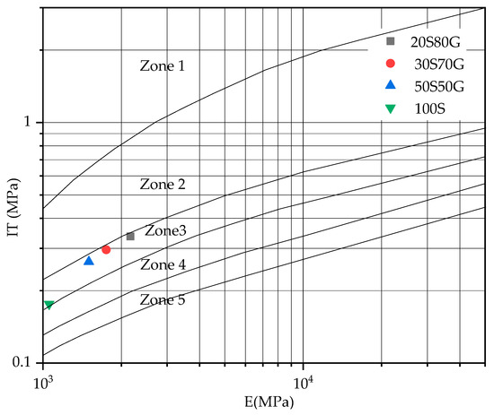 The long-term mechanical properties (i.e., elastic modulus E and tensile strength TS) of the mixes were determined to evaluate whether they can be used in road subgrade construction. The tensile strength was determined using ITS. The mechanical properties were measured after 90 days of curing. For a use in subgrade, the couple of elastic modulus and strength must be at most of a resistance class 5 (zone 5). Figure 7 shows the classification of each mix. The results show that mixes 20S80G, 30S70G and 50S50G had a resistance class 3 while mix 100S had a resistance class 4. It can be concluded that mixes show adequate long-term mechanical performance for use in subgrade.