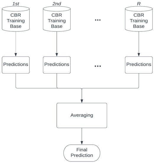 Ensemble learning heavily relies on the combining strategy of multiple predictions into one prediction. In the proposed CBR-BSR method, bagging [] is selected as the ensemble learning method. Bagging combines each bootstrapped data set’s prediction and uses the average of the predictions as the final prediction, as shown in Figure 4. The advantages of bagging are two-fold. First, CBR can learn from a diverse set of training sets that were created using bootstrapping. Second, bagging as an ensemble learner reduces the overfitting of the model [].
