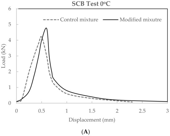 Table 9 below shows the fracture energy for each specimen. Fracture energy is a failure property that is used to evaluate resistance to cracking in asphalt mixtures, and it refers to the total energy that is applied to the specimen until the specimen fails. In the test results, the ERCRP-modified specimens had a superior fracture energy value of 820 J/m2 at −0 °C, which was 8% higher than that of the reference specimens (766 J/m2), indicating this mixture also acquires a higher resistance for practical application in cold regions. Considering the conditioning at −12 °C, the average fracture energy was 518 J/m2, which was 23.75% larger than that of the control specimen.