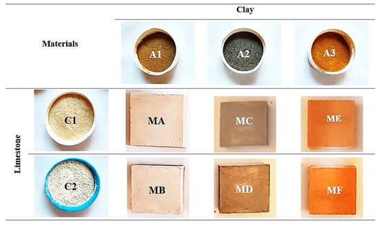 X-ray diffraction analysis identified the mineralogical composition of the dry powders in each sample. The raw materials collected were composed of three types of clays and two limestones, as shown in Figure 4.