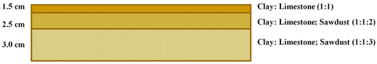 Subsequently, the combined samples were mixed manually, ensuring their homogeneity with water until achieving a plastic texture, where each of them was worked under a dosage proposed by a mix design of clay–carbonate–sawdust in proportion 1:1:0 (1.5 cm), 1:1:2 (2.5 cm) and 1:1:3 (3 cm), with a thickness of 7 cm, shown in Figure 2. Once obtained, the homogeneous mixture was poured into molds of 20 cm × 20 cm, following the determination of the dimensions given by the Mexican standard NMX–C–038–ONNCCE–2013 [28].