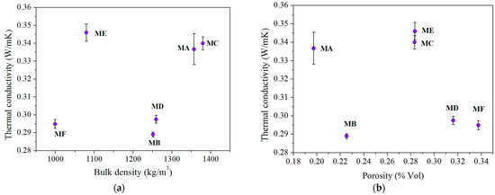 Then, in Figure 5, the relationship is applied between the physical quantities for the first parameter mentioned. In both cases, there is no linear correlation between the variables analyzed. In the case of bulk density, there is a significant trend in samples about thermal conductivity that obeys the theory stipulated in the thermal behavior of ceramic materials. Nonetheless, by taking the ME with a slightly higher thermal conductivity than the MA and MC as an example, the density is approximately 20% lower than the last-mentioned samples. Likewise, some samples with relatively low porosity have a higher thermal insulation value and vice versa, as in sample MB.