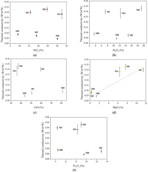Thermal conductivity as function of (a) SiO2, (b) Al2O3, (c) CaO, (d) MgO, and (e) Fe2O3.